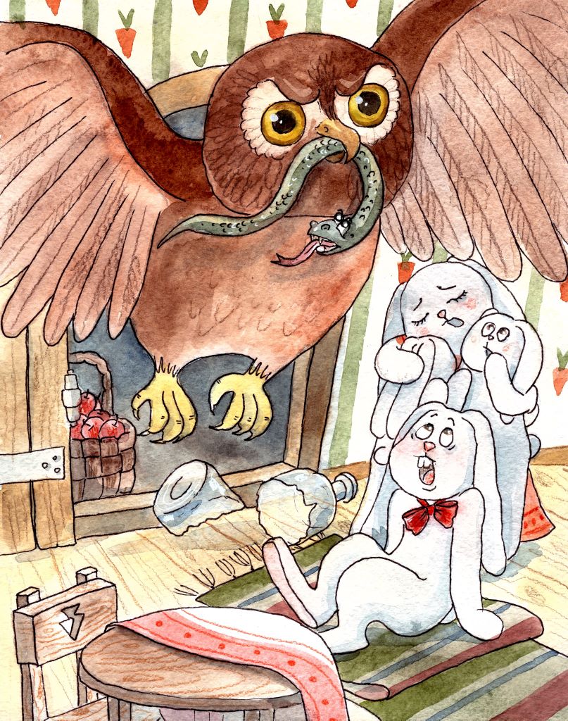 А в доме шум да гам стоит! Из кладовой вылетела сова, а в клюве змей висит, шипит, вырывается. Но сова его крепко держит. Вылетела из норы зайцев и давай клевать змея со всей силы.