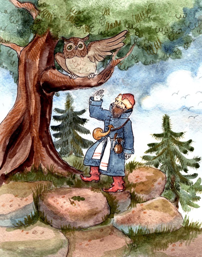 Очнулся купец-молодец, ищет свою суженую, найти нигде не может. Поднялся купец на гору, видит старый дуб. На нем филин сидит.