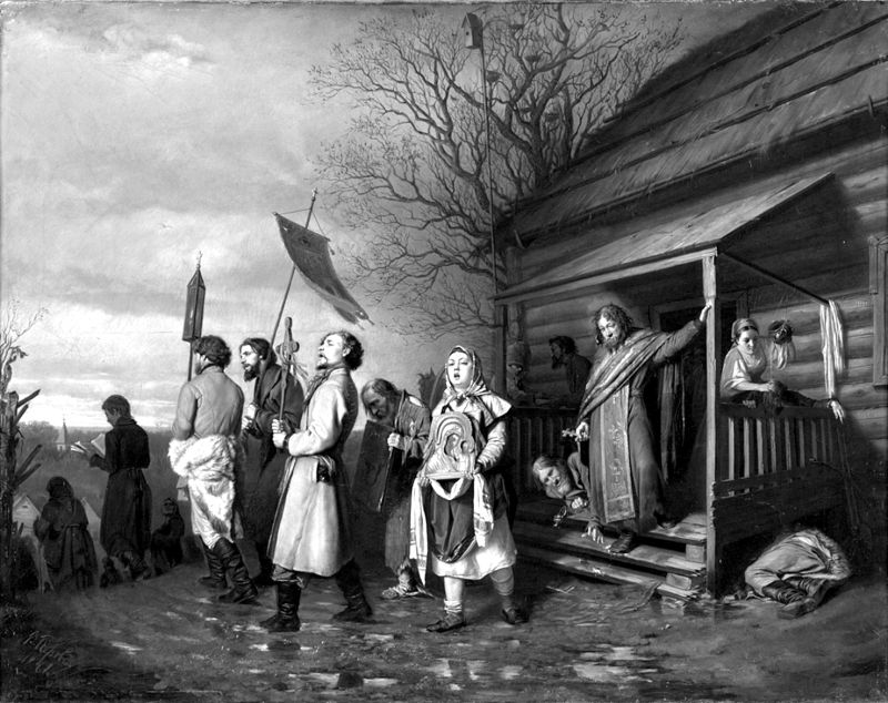 В 1861 году скандал в обществе вызвала картина В. Перова «Сельский крестный ход на Пасхе». На картине мы видим совершенно пьяного священника и свалившегося на землю причётника. По требованию властей, купивший эту картину Третьяков вынужден был убрать ее из экспозиции. А самого Перова даже пытались привлечь к суду за богохульство, но ему удалось доказать, что в подмосковных Мытищах такие «крестные ходы» устраиваются регулярно. Именно это время Бисмарк выдал одну из своих крылатых фраз, заявив, что «русский народ имел бы блестящую будущность, если бы не был поголовно заражён пьянством».