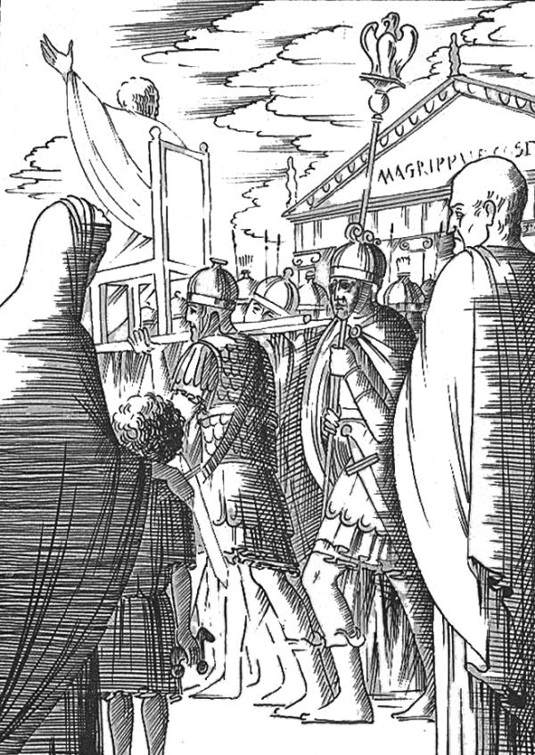 День приближался уже к вечеру, когда вблизи дворца вновь раздались оглушительные крики ликования, возвещавшие Агриппине о приближении Нерона, возвращавшегося в сопровождении Бурра, Сенеки, преторианцев и целой толпы шумно ликовавшего народа из курии во дворец.