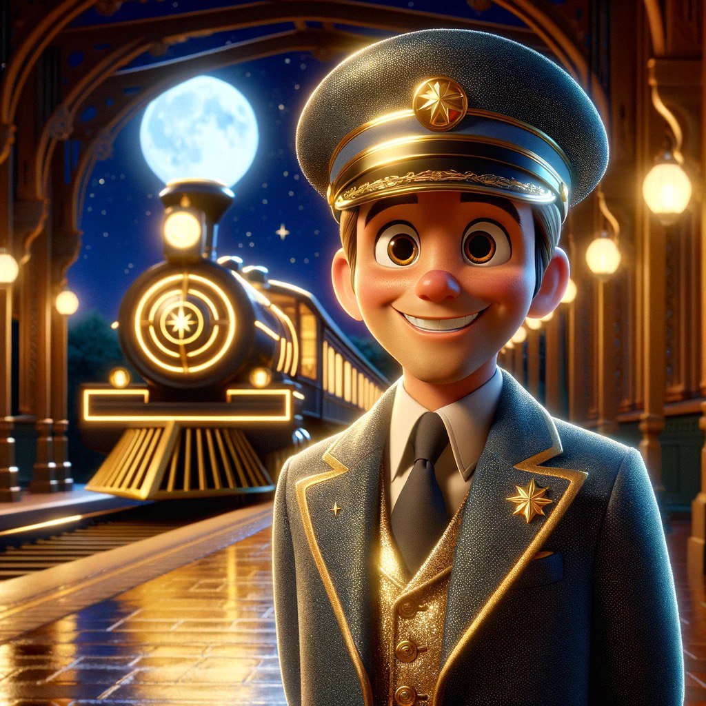 Когда двери вагонов распахнулись, из поезда раздался чистый, приветливый голос, приветствующий их. Молодой человек в униформе, стоящий на ступенях одного из вагонов, был одет в элегантную форму, которая искрилась под лунным светом, а его золотой козырек и значок волшебного поезда сверкали, словно звезды. Его улыбка была теплой и уверенной, а глаза скрывали мудрость и доброту.