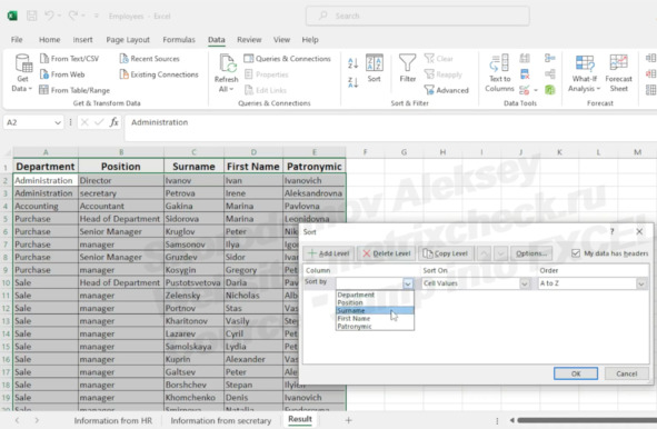 After the sorting is done, the order of the rows with surnames on the «Result» sheet matches the order of the rows on the «Information from HR» sheet.