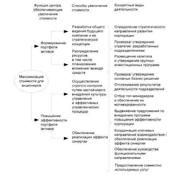 Функции головного офиса зависят прежде всего от наличия возможностей увеличения стоимости для отдельных направлений или компании в целом за счет синергетических эффектов или лучшей координации деятельности подразделений. Так, штаб-квартира компании может создавать дополнительную стоимость, вырабатывая более качественные стратегические подходы к развитию связанных направлений бизнеса, обеспечивая обмен опытом между подразделениями, работающими на разных рынках, и выгодную для компании в целом кооперацию различных подразделений, которая не произошла бы сама по себе.