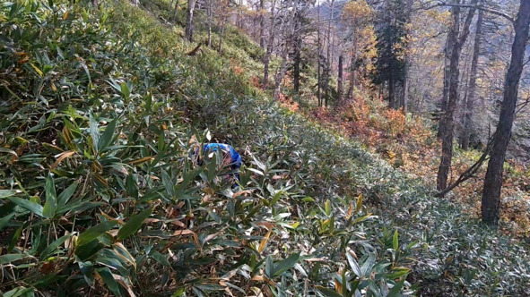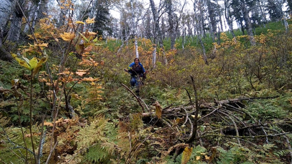 И все же мы трудились. Первым нашим трудом было взять небольшой хребтик, чтобы увалиться на другой ручей, другой долины. В прошлом году я делал это несколько ниже по течению, перед озером, в этот раз мы заблудились за озеро и пошли топтать бамбук вверх. Была боязнь, что бамбучная неприязнь окажется высокой и плохо проходимой. Страх оказался выше действительности и мы быстро взошли на хребтовую часть. Что хотелось бы сказать отдельно бамбук в этой части Сахалина растет сугубо с южной стороны хребтиков. Все северные склоны выявили дивную чистоту от сазы курильской. От того мой совет если топтать здесь маршруты, то лучше делать с севера. Спускаться по бамбуку значительно проще, чем подниматься, за этим вы не испытаете тех трудностей, пусть и довольно скромного порядка, которые упали на наши с Таней плечи.