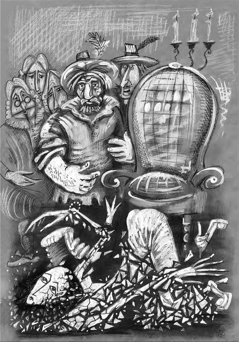 Он не врал. Оказалось, что когда замок Зеркальной королевы разрушился, все зеркала погасли, а жители королевства ослепли. Картина была ужасная: слепые матери пытались накормить слепых детей, слепые работники пытались как-то сделать свою работу, люди постоянно сталкивались друг с другом, падали, пачкались и плакали от своей беспомощности. И теперь жители только ругали Робина, поскольку влачили жалкое существование, а славили Черного герцога, который ими руководил.
