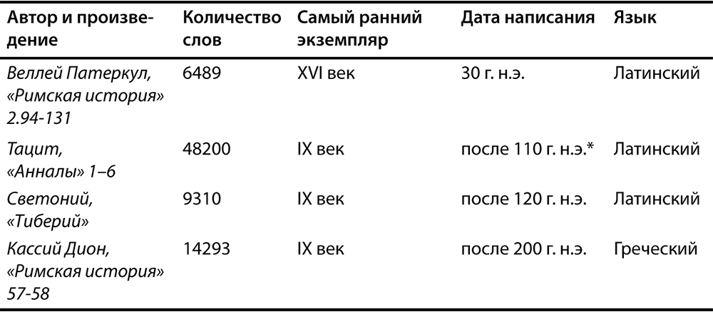 За исключением Веллея Патеркула, который был современником Тиберия, все остальные источники, рассказывающие о жизни императора, появились через восемьдесят или через более чем сто лет после его смерти. Самые ранние из сохранившихся копий были созданы гораздо позже, и их гораздо меньше, чем число сохранившихся копий Евангелий. Вскоре мы увидим, что промежуток времени, отделяющий создание Евангелий от описанных в них событий, гораздо меньше восьмидесяти лет.