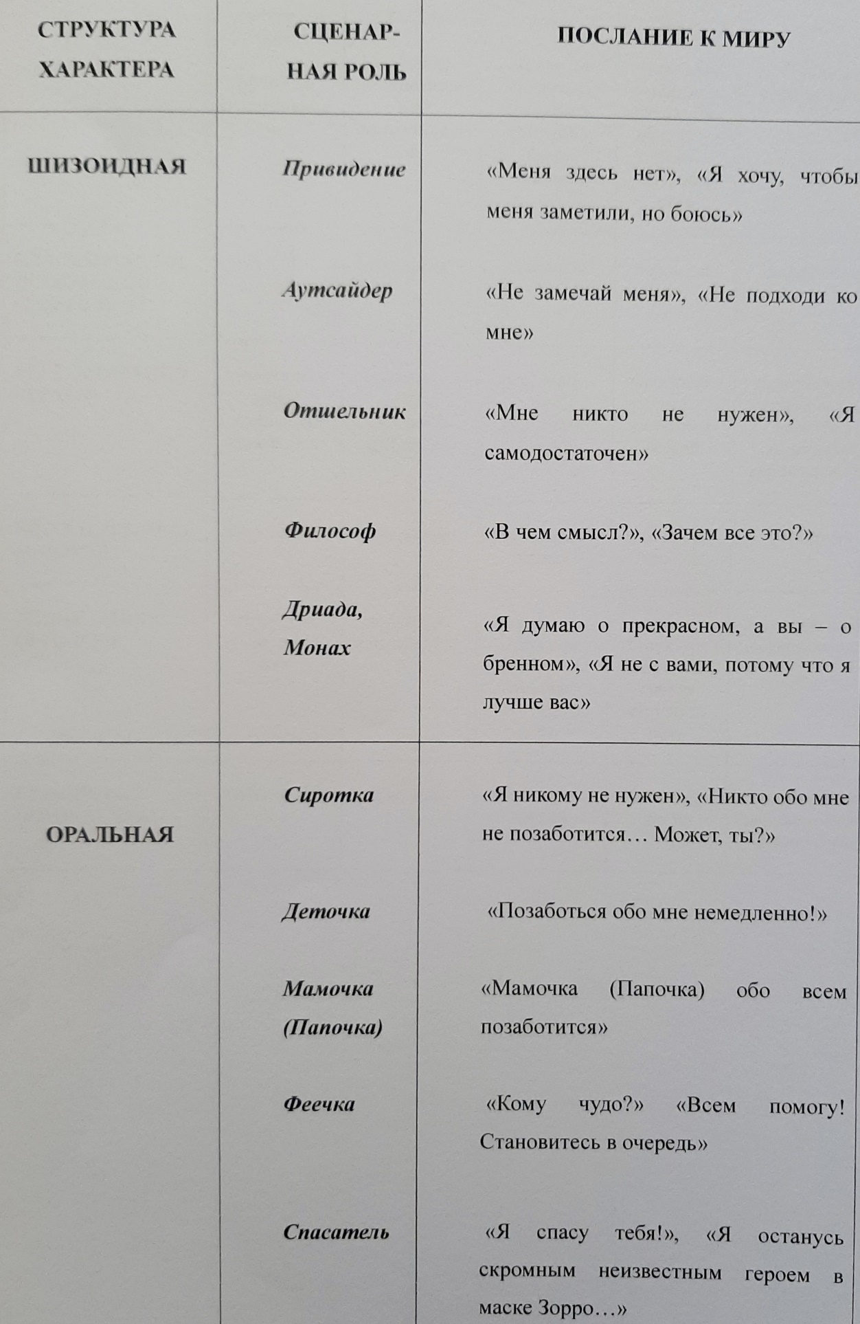 Таблица 2. Сценарные роли структур характера, таблица составлена Соловьевой И.А