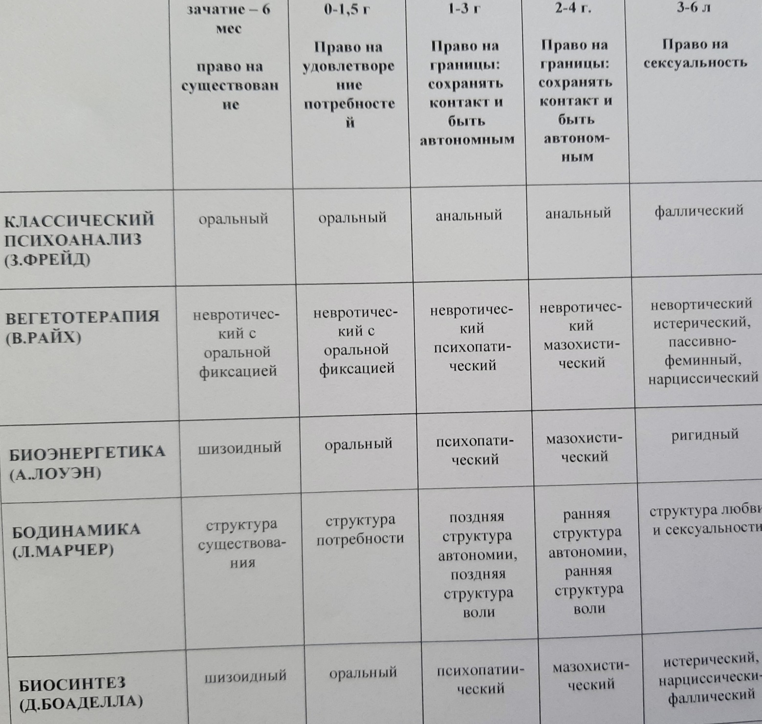 В разных школах ТОП различаются точные возрастные периоды, названия для формирующихся типов, но представление о базовых потребностях ребенка и их нарушениях сохраняется. Используя различные системы структур характера в ТОП, сравнивая их между собой, обобщая или, напротив, выделяя различия, я постепенно пришла к системе из 5 структур характера.