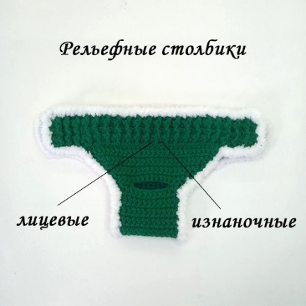 Вязание выпуклых (лицевых) рельефных столбики и вогнутых (изнаночных) различается только методом введения крючка. Так при вязании лицевых рельефных столбиков крючок вводим не под основание столбика прошлого ряда, а под ножку столбика с лицевой стороны. При вязании же изнаночных столбиков крючок вводим под ножку столбика с изнаночной стороны