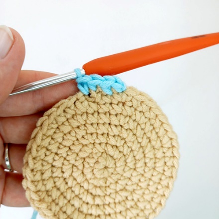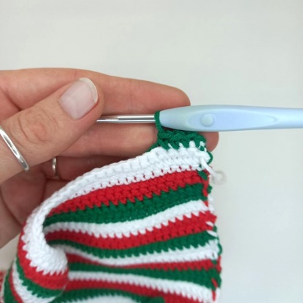 1. Не довязываем последний столбик в ряду перед сменой цвета пряжи следующим образом: крючок вводим в последнее основание столбика, захватываем рабочую нить, протягиваем ее через основание на крючке 2 петли.
