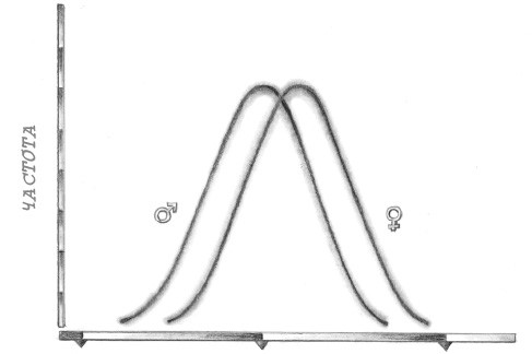 Половое различие может выражаться или только в разных средних значениях (как в случае некоторых тестов на навыки чтения, где у женщин результаты выше), или только в различном разбросе (как в случае коэффициента интеллекта, IQ, где у мужчин больший разброс по баллам), или и в том и в другом, как мы видим на примере роста{15}. Первые два случая показаны на графиках ниже.