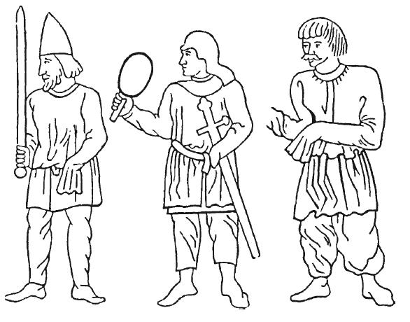 Таким образом, горловину можно было затянуть или оставить широкой. Верхний край нижней куртки, более короткой и облегающей, но такого же покроя, выглядывал в большей или меньшей степени. У верхней куртки вырез был либо на груди, либо спереди от подола до талии; иногда куртка делалась распашной спереди.