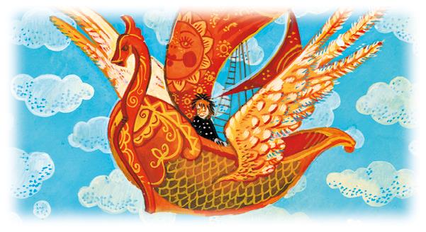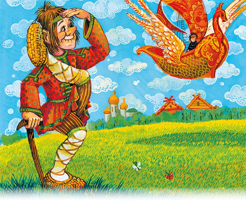 Летели-летели, глядь несёт человек за спиною полон мех хлеба. «Здоров, дядьку! Куда идёшь?» «Иду, говорит, добывать хлеба на обед». «Да у тебя и так полон мешок за спиною». «Что тут! Для меня этого хлеба и на один раз укусить нечего». «Садись-ка с нами!» Объедало сел на корабль, и полетели дальше. Летели-летели, глядь ходит человек вокруг озера. «Здоров, дядьку! Чего ищешь?» «Пить хочется, да воды не найду». «Да перед тобой целое озеро; что ж ты не пьёшь?» «Эка! Этой воды на один глоток мне не станет». «Так садись с нами!» Он сел, и опять полетели. Летели-летели, глядь идёт человек в лес, а за плечами вязанка дров. «Здоров, дядьку! Зачем в лес дрова несёшь?» «Да это не простые дрова». «А какие же?» «Да такие: коли разбросить их, так вдруг целое войско явится». «Садись с нами!» Сел он к ним, и полетели дальше. Летели-летели, глядь человек несёт куль соломы. «Здоров, дядьку! Куда несёшь солому?» «В село». «Разве в селе-то мало соломы?» «Да это такая солома, что как ни будь жарко лето, а коли разбросаешь её так зараз холодно сделается: снег да мороз!» «Садись и ты с нами!» «Пожалуй!» Это была последняя встреча; скоро прилетели они до царского двора.