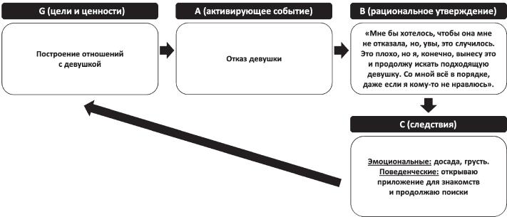 Таким образом, вырабатывая и тренируя привычки рационального мышления, человек получает возможность не просто снижать уровень чрезмерных негативных эмоций, а выбирать здоровые негативные эмоции, которые, с одной стороны, не ведут к неадаптивному поведению, а с другой не блокируют способность адаптивного поведения для достижения человеком целей или мотивированного преодоления трудностей. Эллис таким образом описывает разницу между нездоровой тревогой и здоровым волнением: «Озабоченность, осторожность, предусмотрительность помогут вам сохранять бдительность и оставаться в безопасности; в то время как неоправданная тревога, паника, страх сделают вас беззащитными» (Эллис, 2021). Отличия гнева и раздражения автор РЭПТ объясняет так: «Если к вам относятся несправедливо, вы вполне законно испытываете недовольство и решимость принять меры к изменению ситуации. Но можно выбрать и неуместные чувства гнева и тогда будете только ныть, страдать и бездействовать» (Эллис, 2021).