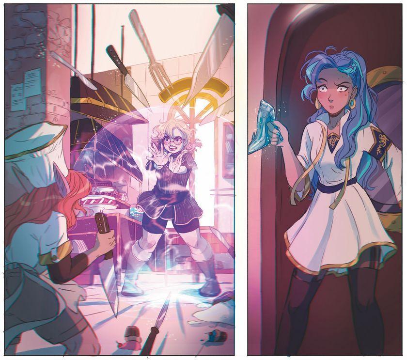 Увернувшись от овощечистки (на самом деле она задела и «подровняла» ей челку), Луна поспешила воспользоваться своим волшебством. Энергия хлынула наружу и создала фиолетовый защитный барьер, загородив девушку от гнома, но это не остановило соперницу, продолжавшую запускать в нее ножи, кастрюли и даже пугающе острую ложку.