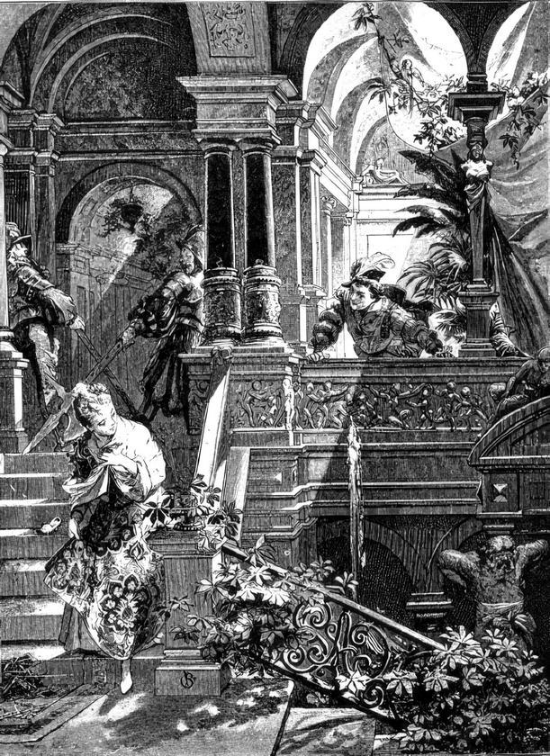 По наступлении вечера Замарашка надумала удалиться, а королевич пошел за нею следом и хотел посмотреть, в какой дом она войдет; но та юркнула в сторону и убежала в сад позади дома. В том саду росло прекрасное большое грушевое дерево, и на нем много было чудных груш; на него-то и взобралась Замарашка, словно белочка, и укрылась в ветвях его; а королевич даже и не знал, куда она подевалась.