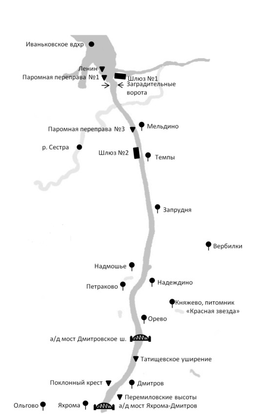 Начался кровавый бой, который продолжался весь день и ночь. Силы и опыт ведения боя были неравными, поэтому решили взорвать мост через канал и выпустить из него воду. Обратите внимание, мы проходим под современным автодорожным мостом, построенным в начале нового века на месте старого. 29 ноября 1941 года этот важный стратегический объект был взорван советскими воинами, чтобы не допустить перехода немецкой техники на другую сторону канала. Поймы рек Яхрома и Сестра были затоплены, превратились на морозе в гигантский каток, а канал стал ловушкой для танков. Сверху лед, а под ним пустота. Немецкие хваленые машины с треском должны были провалиться в эту дыру, повторяя сцену ледового побоища из фильма «Александр Невский».