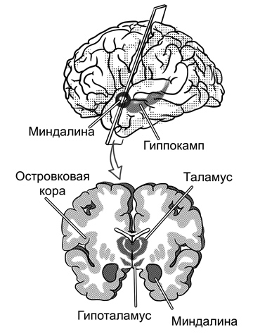 Рис. 2.1. Схема поперечного среза головного мозга человека (вид снизу). Отмечены верхняя и нижняя части промежуточного мозга (таламус и гипоталамус), а также миндалина (относится к базальным ганглиям конечного мозга). Хорошо видна боковая борозда и находящаяся на ее дне островковая кора. Скопление серого вещества над миндалиной двигательные области базальных ганглиев. На верхней схеме отмечен гиппокамп (также см. рис. 3.2 в главе 3)