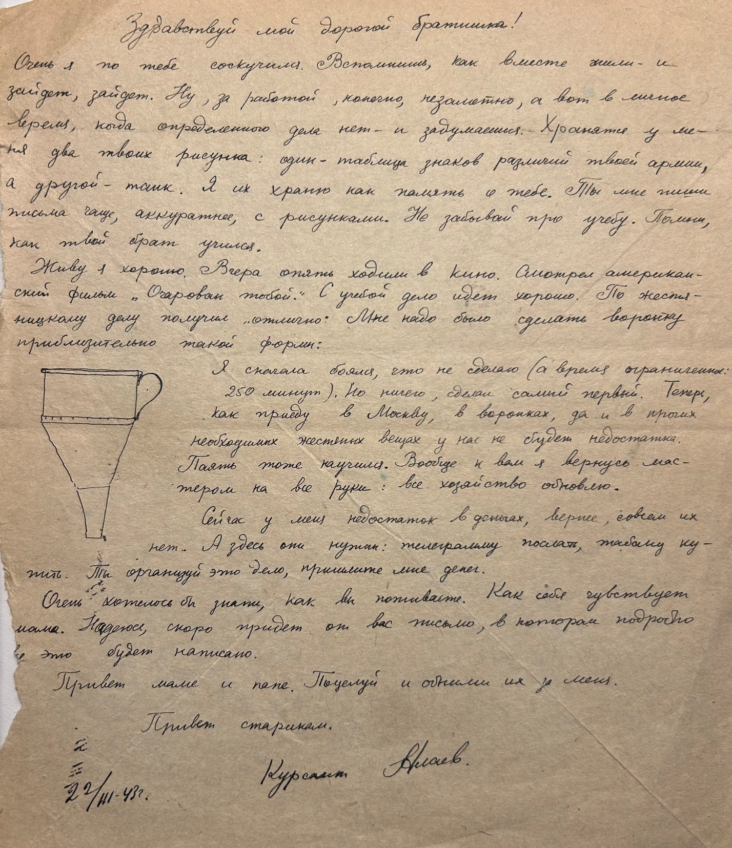Очень я по тебе соскучился. Вспоминаешь, как мы вместе жили и зайдет, зайдет. Ну, за работой, конечно, незаметно, а вот в личное время, когда определенного дела нет и задумаешься. Хранятся у меня два твоих рисунка: один таблица знаков различий твоей армии, а другой танк. Я их храню, как память о тебе. Ты мне пиши письма чаще, аккуратнее, с рисунками. Не забывай про учебу. Помни, как твой брат учился.