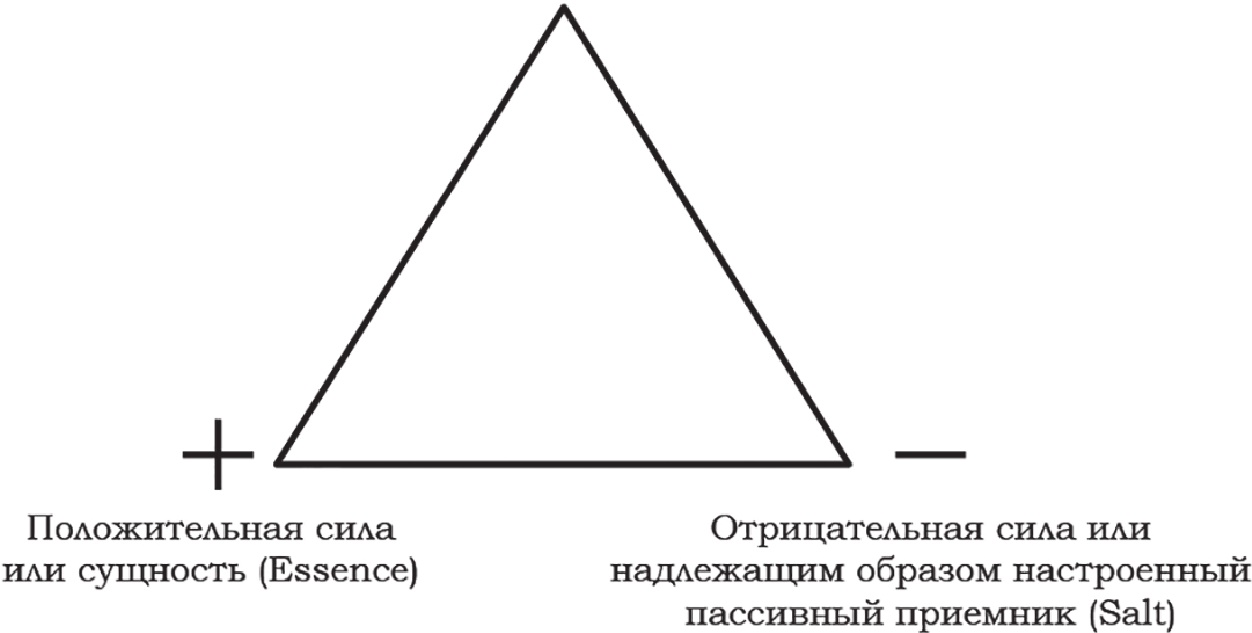 Для иллюстрации схемы истинного проявления, получаемого в алхимии путем объединения «сущности» с «солью», весьма удобно использовать фигуру треугольника (см. рис. 1).