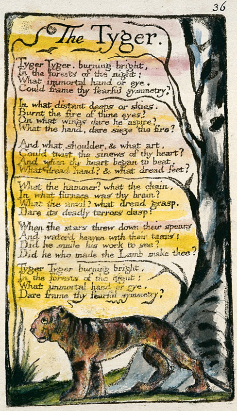 Оттого переходим к «Тигру». «Тигр» почти наверняка не самое значимое произведение Блейка, хотя бы с точки зрения объёма но, если не ошибаюсь, самое известное. В списке «Двадцати великих шедевров [английской литературы]», составленных Джошуа Вайнером, оно стоит на пятом месте.11 Вероятно, вполне заслуженно. Стихотворение входит в цикл «Песни невинности и опыта», оно было размножено Блейком обычным для него способом гравировки. Взгляните, кстати, на копию одного из первых экземпляров.