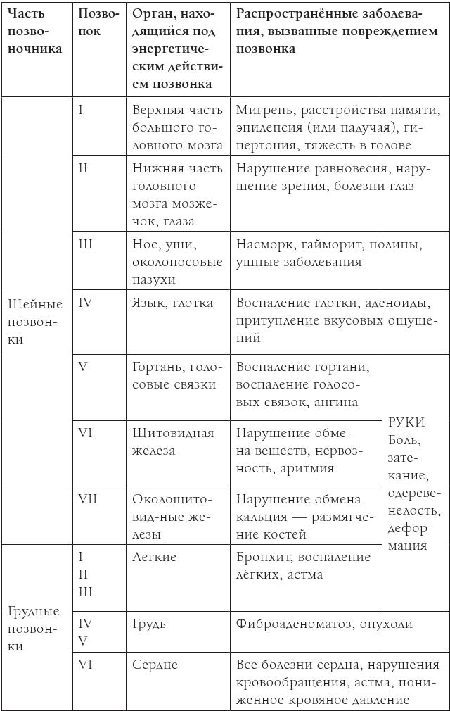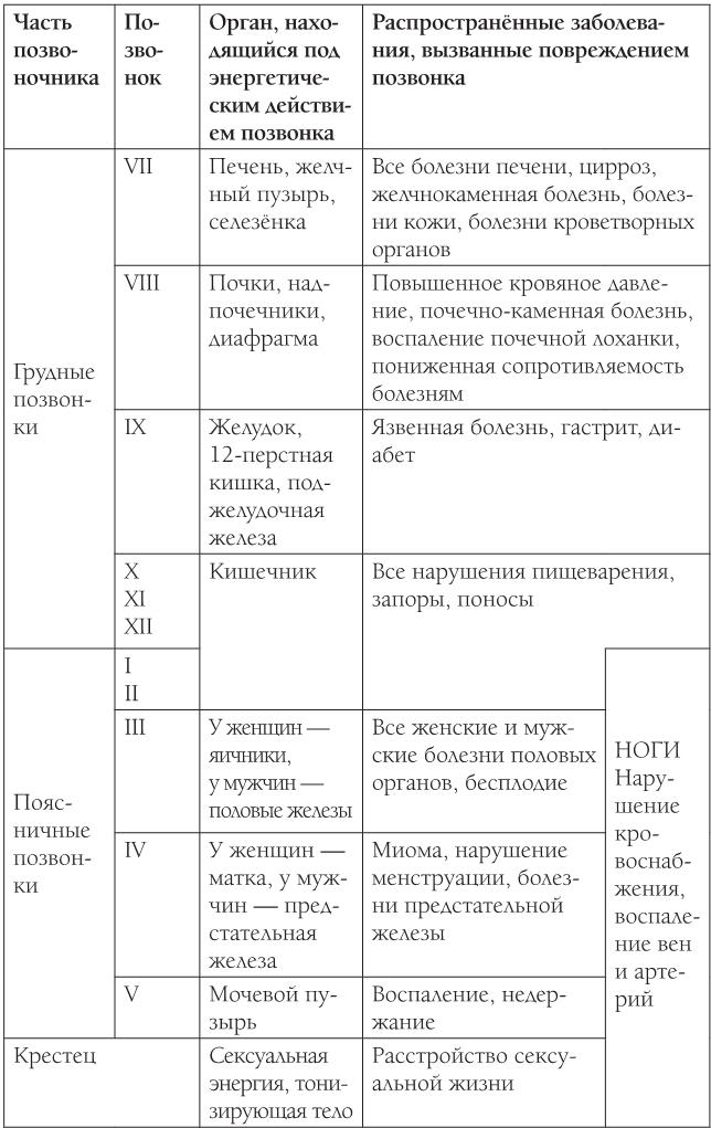 Область поражения позвонка (справа-слева, спереди-сзади, вверху-внизу) находится в прямом соответствии с болезнью. Например, если 6-й грудной позвонок поражён спереди, то очаг болезни в сердце расположен на передней стенке. Понятия справа-слева, спереди-сзади, вверху-внизу очень значимы для понимания недугов человеческого тела.