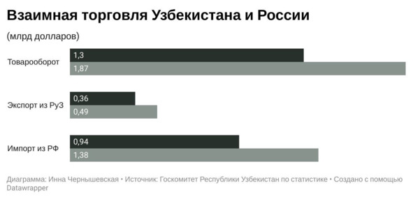 В целом, роль северного соседа во внешней торговле Узбекистана не изменилась. Россия по-прежнему занимает второе место в списке ведущих торговых партнеров страны после Китая. Узбекистан поставляет в РФ фрукты и овощи ($40 млн за январь-март 2022 года), текстиль и одежду ($252,4 млн), у россиян в свою очередь она покупает машины и транспортное оборудование ($168 млн), промышленные товары ($143 млн) и т. д.