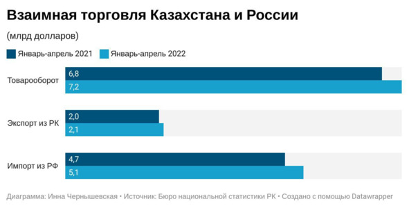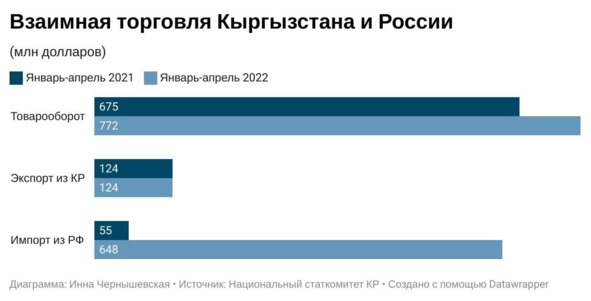 На экспортные направления из Кыргызстана в Россию украинский фактор фактически не оказал влияния. Как и в начале прошлого года, КР реализовал своему партнеру по ЕАЭС товаров на $124 млн. В целом, в январе-апреле этого года Национальный статистический комитет КР зафиксировал рост товарооборота Бишкека с Москвой на 14%, с $675 млн до $770 млн. Но это произошло только за счет наращивания импортных поставок из РФ.