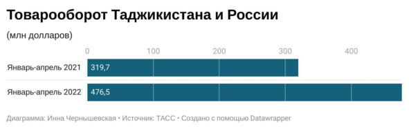 Оценка взаимного товарооборота Таджикистана и России стала достоянием общественности благодаря встрече начальника управления внешнеэкономического сотрудничества Минэкономики и торговли РТ Дилшода Шарифи с представителем правительства Санкт-Петербурга Арби Абубакаровым в мае этого года. По данным агентства ТАСС со ссылкой на ведомство в Таджикистане, товарооборот между странами в стоимостном объеме в январе-апреле этого года вырос на 49% и достиг $476 млн. Для Таджикистана Россия была и остается торговым партнером 1.