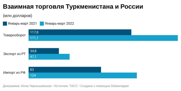 Торговые связи Туркмении с Россией в сложный период 2022 года тоже укрепились. Российские СМИ со ссылкой на заявления Владимира Путина сообщают о росте товарооборота между странами на 45,2%. За первый квартал этого года объем экспортно-импортных операций составил $117,1 млн. Наибольшая доля в этом показателе за российским импортом (72% или $124 млн), именно он продемонстрировал такой значительный рост.