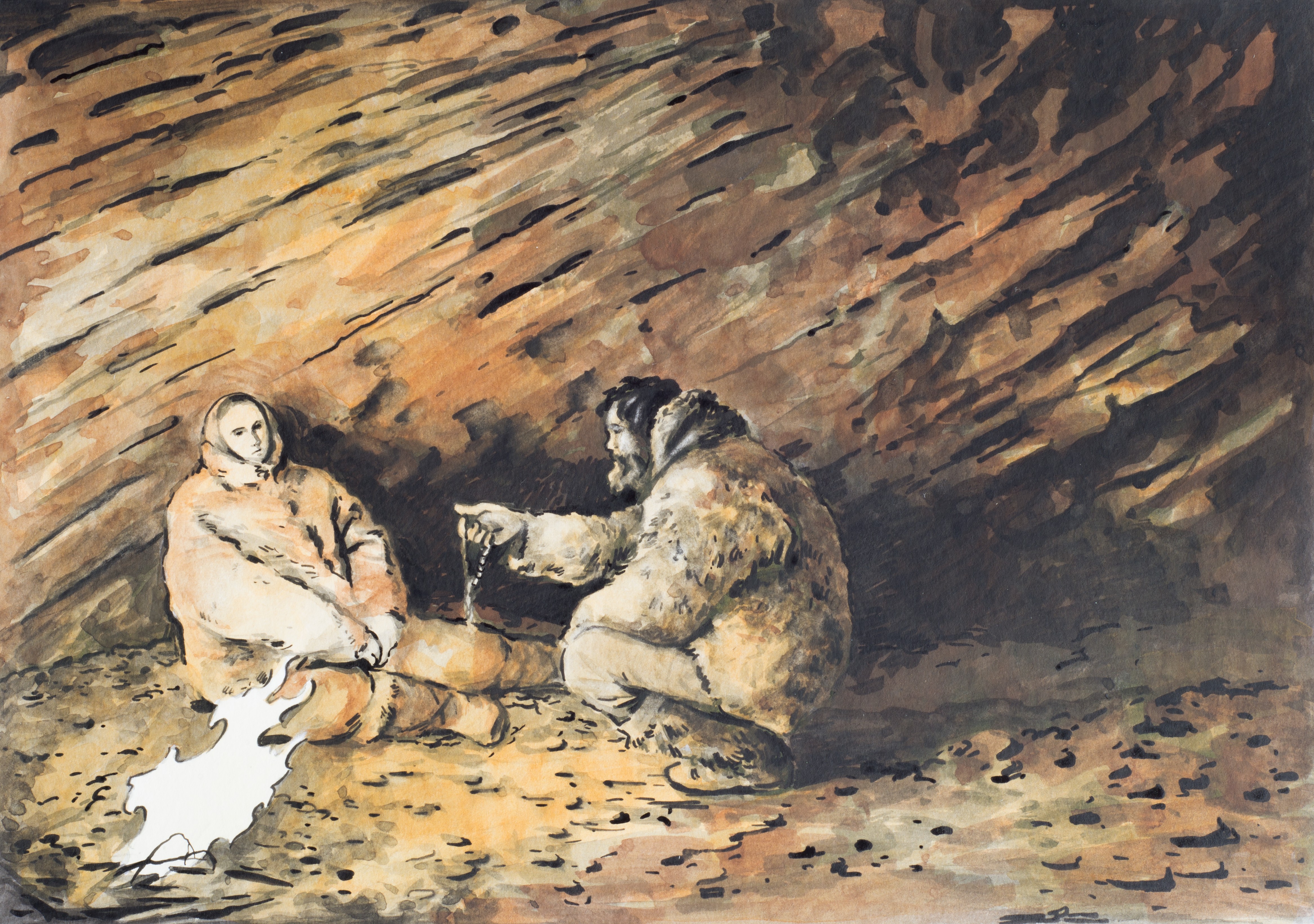 Опершись на руки, она осторожно подалась вперед и села. Что-то тут было не так. Она перевела свой взгляд с огня и посмотрела вперед. Это не чум. А что тогда? Дом? Нет, для комнаты это слишком большое помещение. Рина нащупала стену за спиной. Она была из гранита и очень неровная. Это пещера в скале, догадалась она. Огромная пещера метров тридцать в ширину. Недалеко перед ней, шагах в пяти, сверкала неподвижная зеркальная гладь воды. Озеро? Это подземное озеро в пещере? Вот так чудо! Интересно, как далеко другой край? Но противоположную стену, как и потолок, было невозможно разглядеть в царящем здесь полумраке. Откуда-то лился слабый серебристый свет, который не давал пещере полностью потонуть в кромешной темноте.