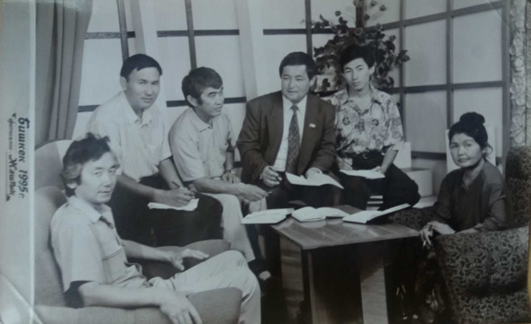 1995жыл. Бишкек. Ноокат Билимкананы колдоочулары: (солдон оңго) китептин автору Замирбек Өсөров, журналист Назаркул Жоошбаев, ишкер Абдисалим Чылымов, агартуучу Омурзак Мамаюсупов, IT-менеджер Нурбек Имакеев, агартуучу Саадат Сатарова.