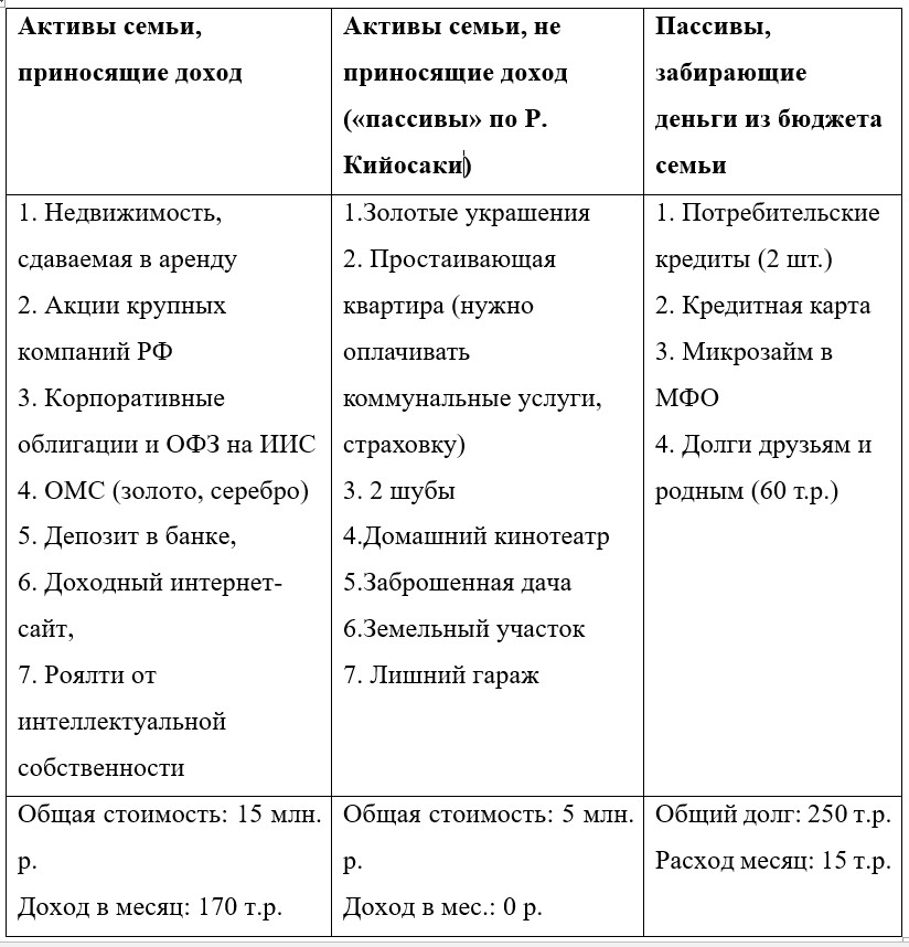 Практическое задание 2. Прописать финансовый баланс вашей семьи. Выписать активы (приносящие и не приносящие доход), пассивы.