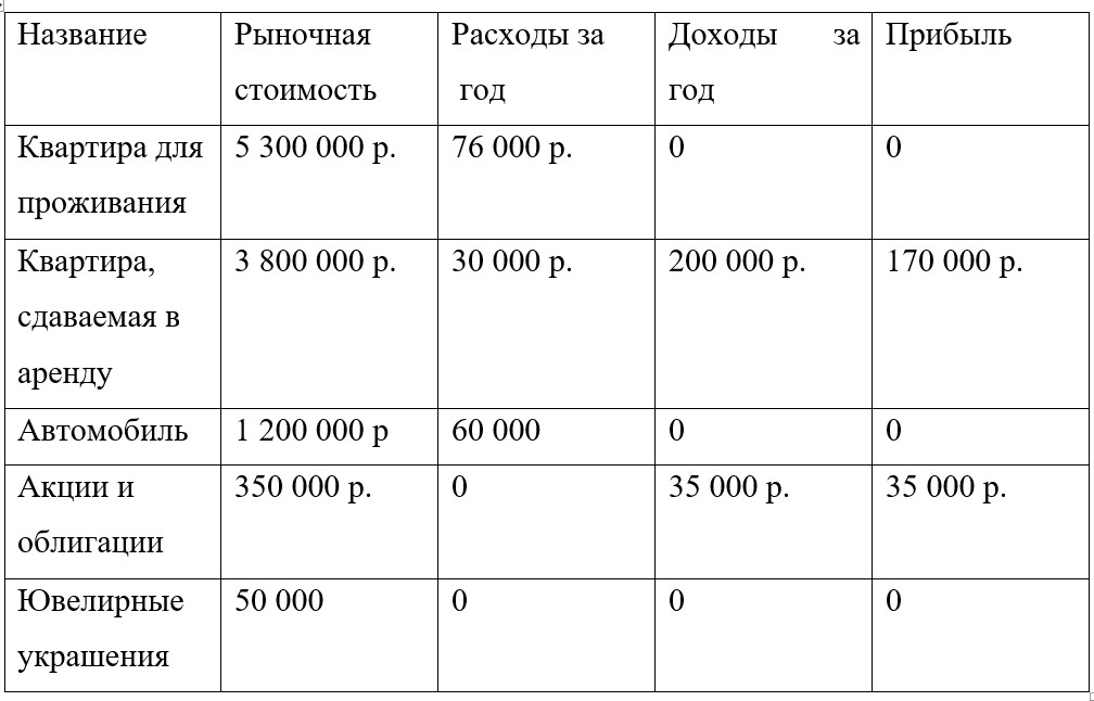 Таблица поможет вам сориентироваться, что из вашего имущества приносит убыток или бесполезно простаивает, а что даёт прибыль.