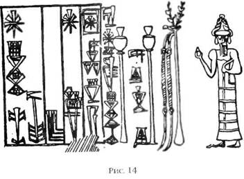 На одной из древних цилиндрических печатей, найденной в Лагаше и принадлежавшей «Урлугаледине, врачевателю», имеется изображение хирургического пинцета. Кроме того, на ней изображена змея на дереве символ медицины и в наши дни (рис. 14). Часто встречается изображение специального ножа, которым повитухи перерезали пуповину новорожденного.