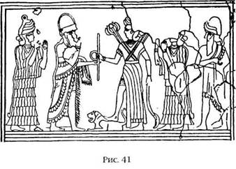 Один лишь дворец в Мари занимает площадь пять акров; в нем археологи нашли тронный зал с великолепными фресками, три сотни разных комнат, помещения для писцов и (самое важное для историков) более двадцати тысяч глиняных табличек с клинописью, рассказывающих об экономике, торговле, политической и общественной жизни той эпохи, о государственных делах и военных походах, о религии, а также о людях, населявших эти земли. Наодной из фресок огромного дворца в Мари изображена коронация царя Зимри-Лима богиней Инанной (амориты называли ее Иштар) (рис. 41).