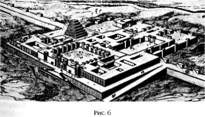 В центре столицы ассирийского царя располагался величественный дворец, стены которого были украшены барельефами; если их выстроить в ряд, то они растянутся на целую милю. Над городом и царским дворцом возвышалась ступенчатая пирамида, называвшаяся «зиккурат»; она служила «лестницей в небо» для богов (рис. 6).