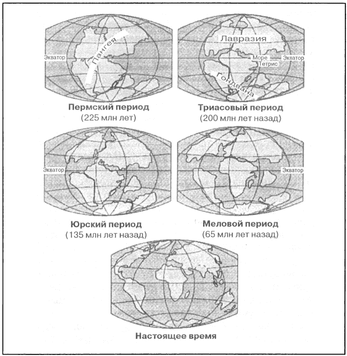 Концепция дрейфа континентов была впервые предложена в 1912 г. Альфредом Вегенером. В 1915 г. вышла его книга, где он выдвинул гипотезу о существовании в глубокой древности единого суперконтинента, названного им Пангеей. Поначалу отвергнутые большинством геологов, идеи Вегенера в конце концов были подтверждены как геологическими данными, так и открытием тектоники плит, обеспечившей механизм перемещения материков. На приведенных здесь картах показано изменение поверхности Земли на протяжении геологических эпох. (Из материалов Геологической службы США.)