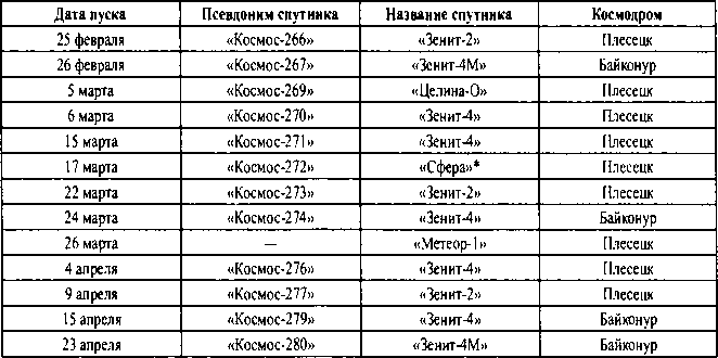 С 1968 г. по 1979 г. произведено 69 успешных пусков КА «Зе-нит-2М», и лишь один пуск закончился аварией ракеты-носителя. В 19701978 гг. производилось по 811 пусков ежегодно.