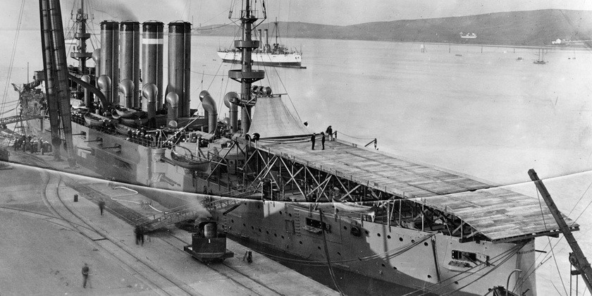 Первая в истории посадочная палуба, сооружённая на юте броненосного крейсера ACR-4 «Пенсильвания», январь 1911 года.
