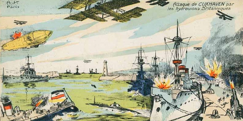 Сильно приукрашенный «Рождественский рейд» британских гидросамолётов на немецкий порт Куксхафен в декабре 1914 г. Французская открытка времён Первой мировой.