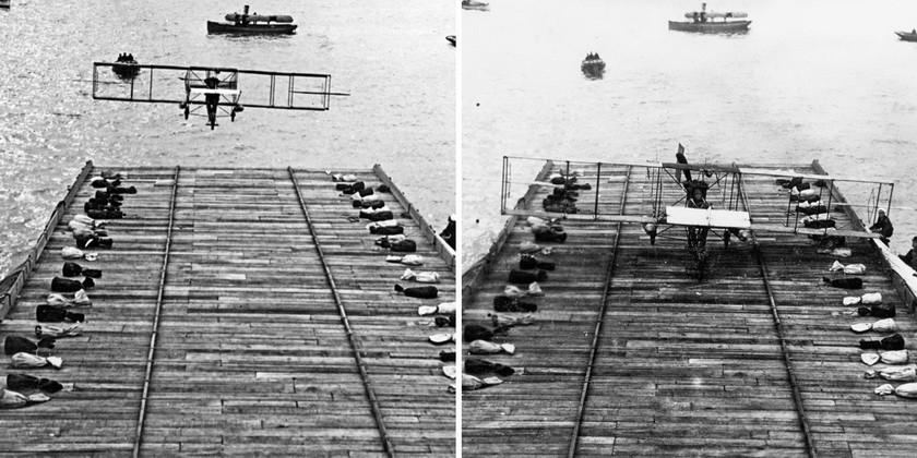 Пилотируемый Юджином Эли аэроплан Кёртисса «Модель D» совершает первую в истории посадку на корабль. Броненосный крейсер ACR-4 «Пенсильвания», 18 января 1911 года.