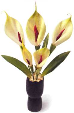 10. Воткнуть каллу в вазочку. Сделать еще 4 цветка. Из зеленой части лука-порея вырезать листики. Нанизать их на кончик зубочистки, воткнуть в вазочку.