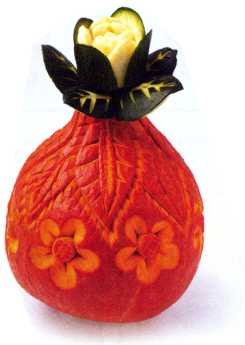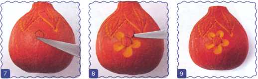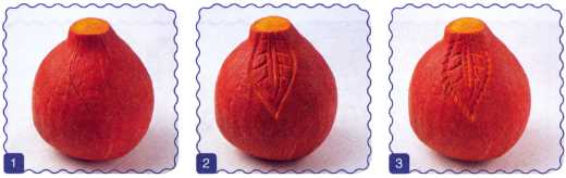 1. Тыкву установить на основание, срезать верхушку. Прорезать контур листочка и, держа нож под углом, срезать полоску кожуры под листочком.