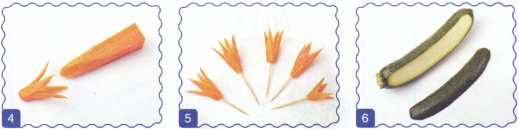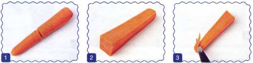 2. По всей длине корнеплода срезать продольные ломтики так, чтобы у моркови получилось 56 граней.
