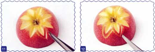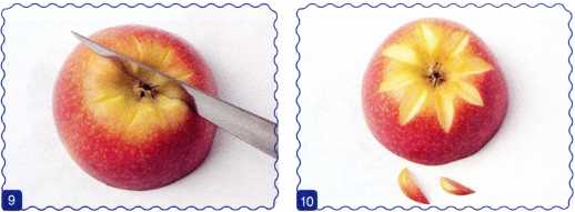 9. Яблоко разрезать пополам. Держа нож под углом, сделать симметричные надсечки по окружности яблока.