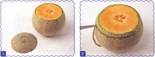 18. Нанизать цветы на шпажки и поставить в вазу из дыни, украсив листиками мяты. Можно также выложить цветы и листочки на блюдо.