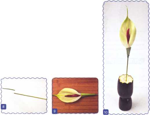 9. Нанизать на шпажку цветок. Вырезать из зеленой части лука-порея чашелистик.
