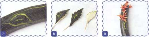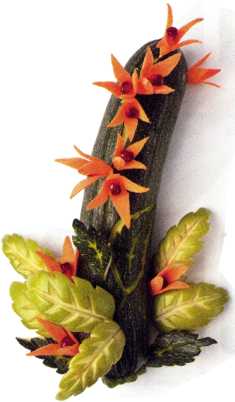 7. Положить цукини срезом вниз, нарисовать контур листочка и стебелька. Вырезать по контуру бороздочки. На листике вырезать прожилки и зубчики.