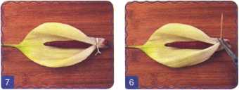 3. Лист лука-порея разрезать вдоль до основания, стараясь не прорезать слой, расположенный под ним. Отделить лист от основания, развернуть и вырезать лепесток каллы ножом или ножницами.